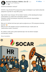 Rovshan Fatullayev, çok paylaşılan bir LinkedIn gönderisinde, devlet petrol şirketinin genel merkezindeki İK gözetim biriminde çalışanların sayısının – kat kat farkla – doğrudan üretimde çalışanların sayısını aştığını ileri sürdü. Ulusal kaynakları çıkarmak ve ekonomiye değer kazandırmak temel misyonu olan bir şirket için, bu oranın savunulması zor, diyor.