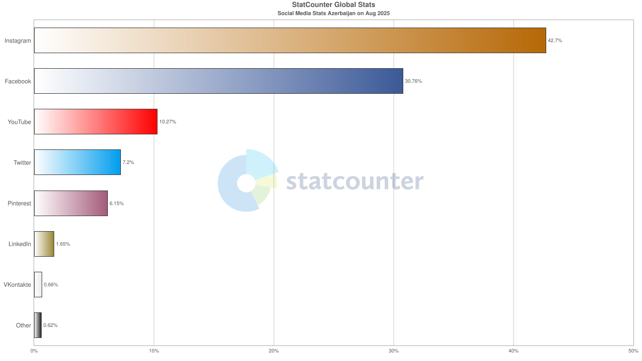 Global Stats’ın yeni verilerine göre Instagram, Ağustos ayında pazar payını %42,7’ye çıkararak Azerbaycan’ın en popüler sosyal ağı olmayı sürdürdü. Platformun payı önceki aya kıyasla 8,69 puan artarak ülkedeki sosyal medya manzarasındaki hâkimiyetini pekiştirdi.
