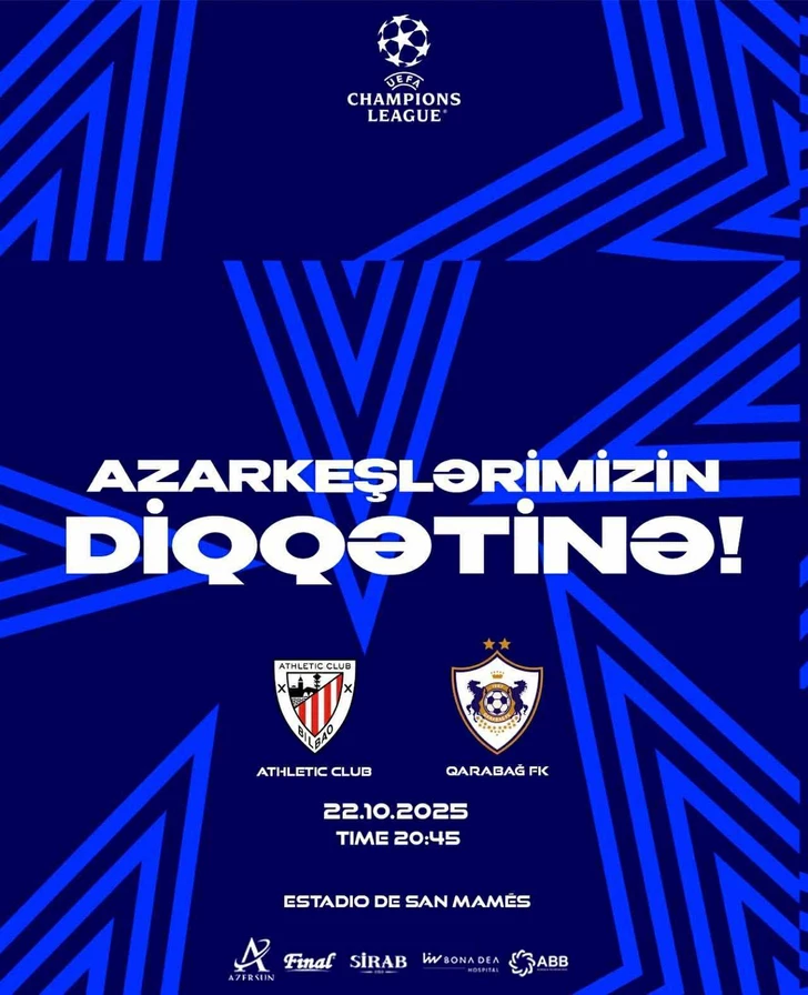 Hatırlatalım, Athletic Bilbao — Karabağ karşılaşması 22 Ekim saat 20:45’te, San Mamés stadında oynanacak.